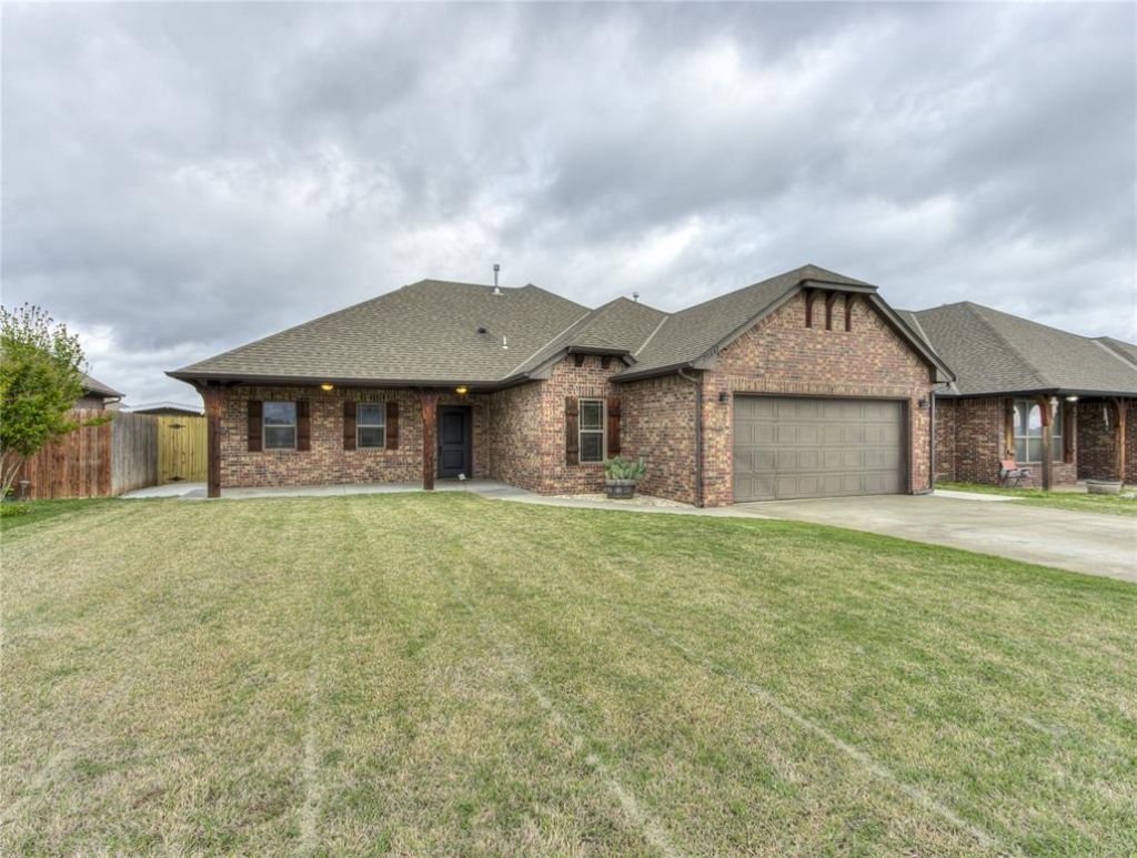 This Harrah home delivers! With 3 bedrooms, 2 bathrooms and 1,578 sq ft of living space, you'll find a functional setup with thoughtful touches throughout, starting with all new carpet and a storm shelter built into the garage foundation.Inside, the living room is filled with natural light from large windows and features a gas fireplace that turns on with a simple switch-clean, easy, and practical. The kitchen and dining area stand out with exposed beams and a layout that works-granite countertops, stainless steel appliances, ample cabinet space, and an island with bar seating and storage.Just off the kitchen, you'll find the laundry room with a nearby flex space, perfect for an office, hobby room, or extra storage-giving you options where it counts.The primary suite includes a large walk-in closet, and the bathroom is well equipped with a double vanity, jetted tub, and tiled shower.Outside, you've got a covered front porch and a large covered back porch, connected by concrete walkways that wrap around to the driveway, plus a French drain system already in place. All set in a quiet neighborhood that keeps things peaceful.If you're looking for a home with solid features, usable space, and a layout that makes sense-this one is worth a look. Don't wait.