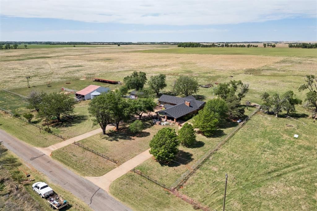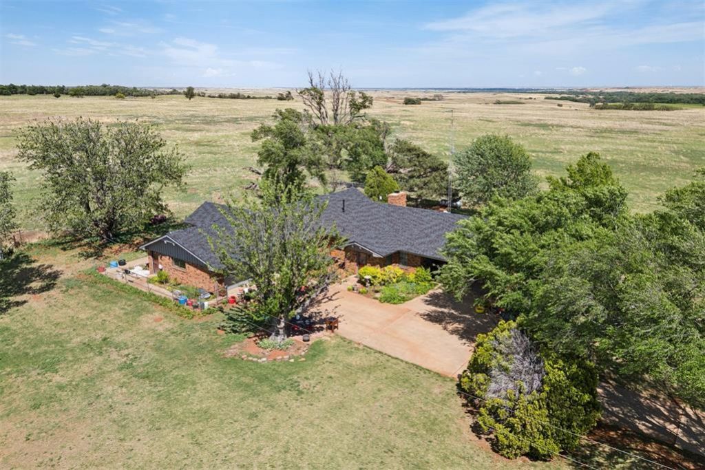Located at 21749 E 1150 Road in Foss, Oklahoma, this beautiful brick home sits on 160 acres and offers the perfect blend of comfort, functionality, and wide-open space, featuring a welcoming circle driveway that passes under the large covered front porch for an impressive and convenient entry. The home includes three bedrooms, two bathrooms, a beautiful fireplace, a spacious foyer, a stunning sunroom off the study, and a private office with its own exterior entry and double closets, ideal for a home business or quiet workspace. A full 17x16 finished basement with bar provides additional space for entertaining or relaxing. Designed with storage and practicality in mind, the home offers closets throughout, a large pantry, a generous laundry room with sink, and a functional mudroom with its own closet. The HVAC system is approximately three years old, and the roof was replaced two years ago with high-end shingles. Outside, the property is equally impressive with five wells, a small pond, a well house with additional storage, and a well-maintained 23x32 barn with concrete floors, along with corral fencing, livestock pens, and shelters already in place. This peaceful property offers beautiful views in every direction while remaining easy to access, making it a rare opportunity to own a well-equipped property with both comfort and capability.