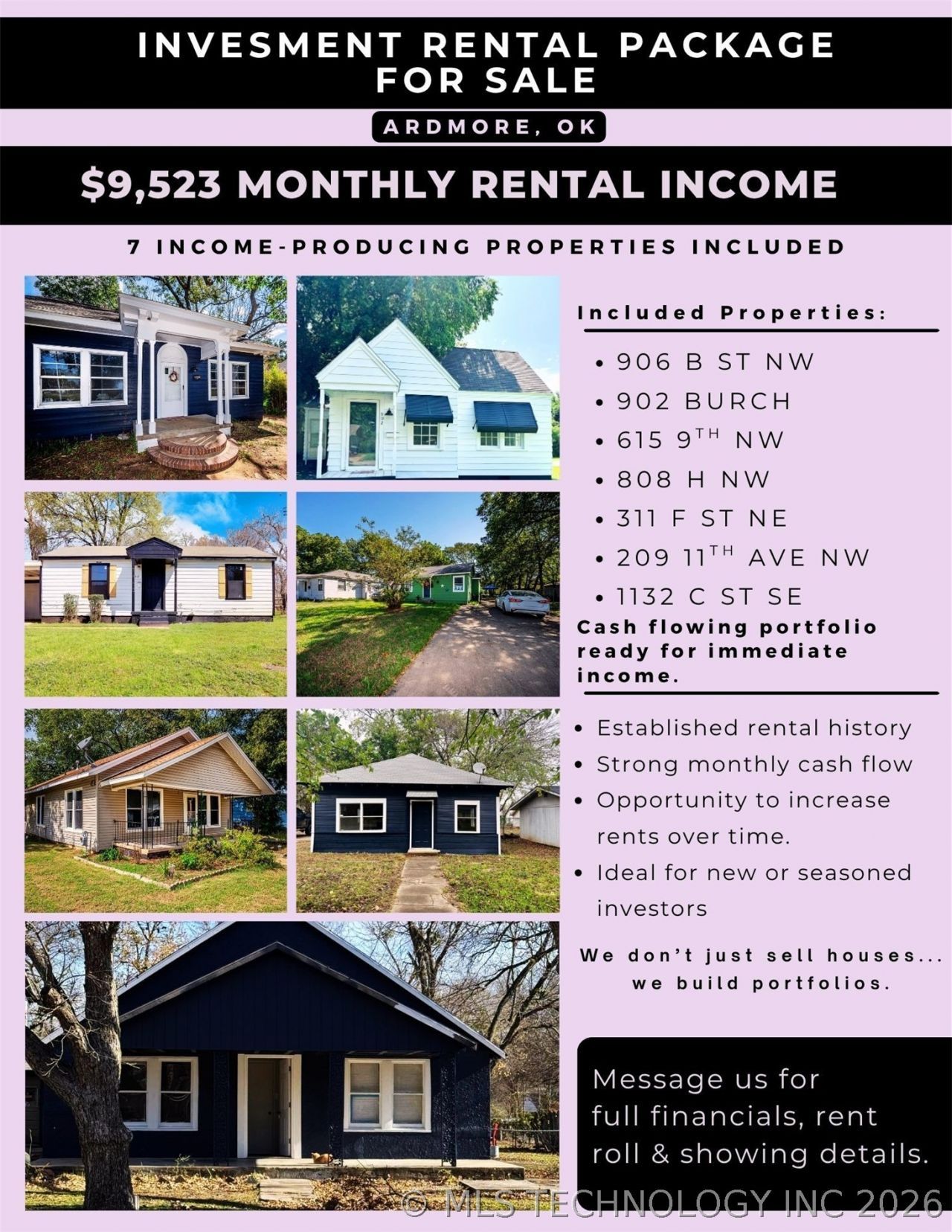 Turnkey investor package featuring 7 properties with 10 total doors, currently generating over $9,000/month in gross rents. Great opportunity to expand your portfolio with established income-producing properties.